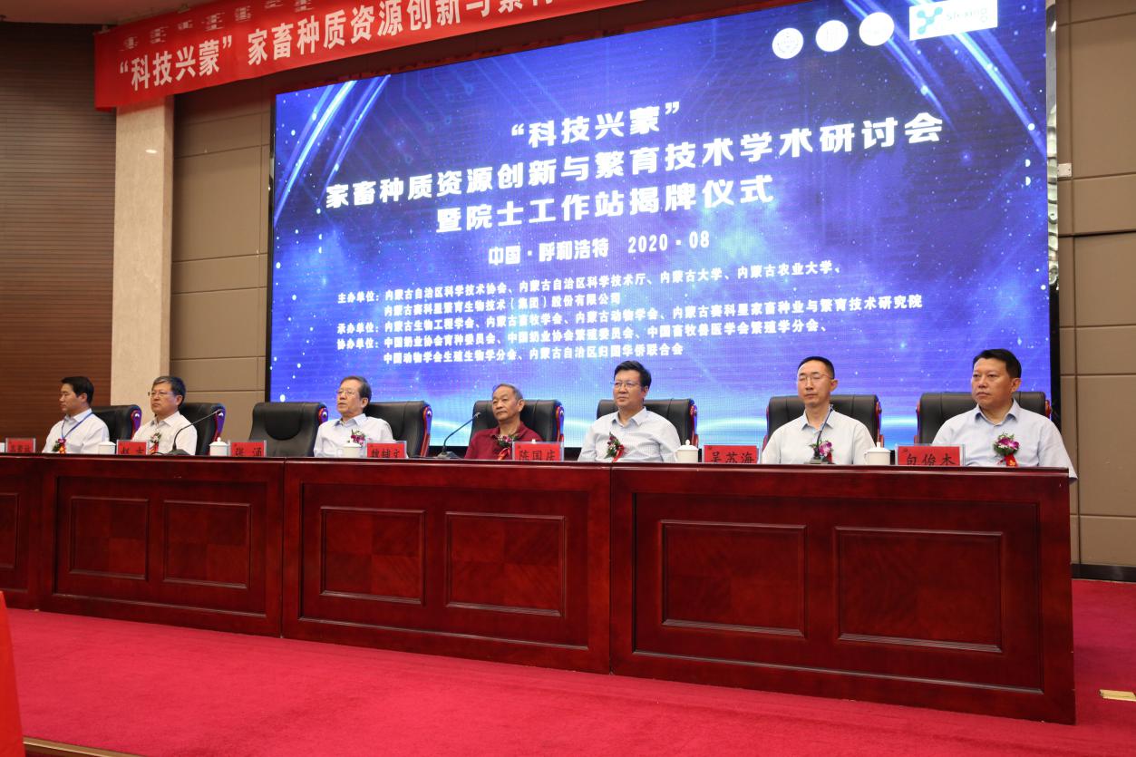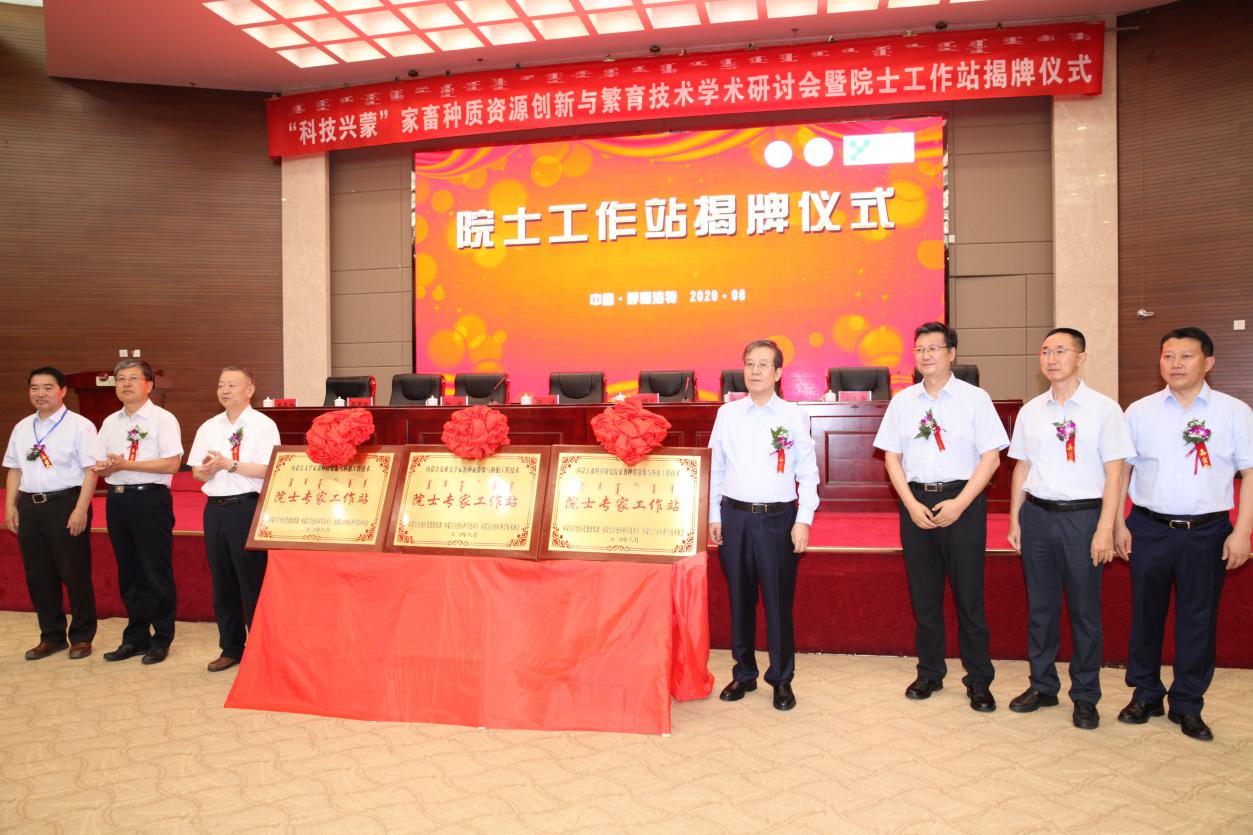 由我校与内蒙古自治区科学技术协会、内蒙古自治区科学技术厅、内蒙古农业大学、内蒙古赛科星繁育生物技术(集团)股份有限公司联合主办,内蒙古生物工程学会、内蒙古畜牧学会、内蒙古动物学会、内蒙古赛科星家畜种业与繁育生物技术研究院联合承办的“科技兴蒙——家畜种质资源创新与繁育技术学术研讨会暨院士工作站揭牌仪式”于8月15日上午在新乌澜大酒店举行。