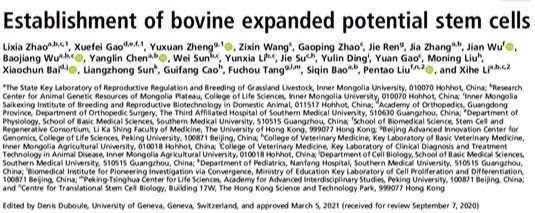 美国科学院院报《Proceedings of the National Academy of Sciences of the United States of America》(PNAS) 在线发表了内蒙古大学、赛科星研究院李喜和教授团队牵头的牛新型干细胞研究的最新成果。本研究首次报道了不依赖外源基因的牛多能性拓展新型干细胞(bovine expanded potential stem cells, bEPSCs)的诱导关键技术及其生物学特性,是草食家畜干细胞研究的里程碑科技成果。