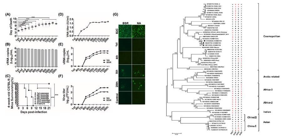 自2016年以来,杨洋副教授团队从内蒙古自治区各地患病家畜脑内分离多株狂犬病毒,并向各单位和个人提供狂犬病的检测和防治方案。2017年,在锡盟地区分离的一株狂犬病毒命名为CNIM1701(GenBank:KY649620),其对成年小鼠极具致死性,连续传代弱化后,失去对成年小鼠致死性,并且在细胞中能快速复制。通过序列比较发现弱化后狂犬病病毒G蛋白83位点发生突变(Lys→Arg)。通过反向遗传学技术证实,当G蛋白的83位点为精氨酸(Arg)时,能增强狂犬病病毒诱导的血脑屏障的通透性,并减弱病毒的致病性。本研究为揭示病毒的致病机制提供了新的思路,有助于设计和开发高度安全的活狂犬病病毒疫苗。该研究成果于2021年2月在《Frontiers in Cell and Developmental Biology》(二区;IF= 5.201) 上发表,题目为“Change in the Single Amino Acid Site 83 in Rabies Virus Glycoprotein Enhances the BBB Permeability and Reduces Viral Pathogenicity”。