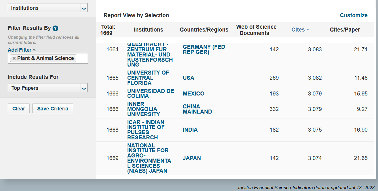根据科睿唯安(Clarivate Analytics)基本科学指标数据库(Essential Science Indicators,简称ESI)北京时间2023年7月13日公布的最新数据,内蒙古大学植物与动物科学学科进入ESI全球前1%。这期进入ESI植物与动物科学的1669所机构,我校排1666位,共发表论文332篇,总被引次数为3079次,篇均被引次数为9.27次。本次ESI统计数据范围覆盖时间为2013年1月1日至2023年4月30日。