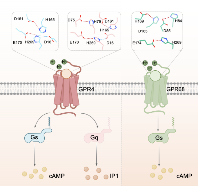 除此之外,研究者还发现不同组氨酸残基的质子化状态会引发GPR4与不同G蛋白亚型的选择性耦联。例如,H792.66的质子化专一性地促进GPR4与Gq的偶联,而对其与Gs的结合无显著影响。这一发现打破了传统对GPCR质子感知机制的认知,并揭示特定质子感知位点可能决定G蛋白亚型选择,从而影响下游信号的特异性功能输出(图5)。