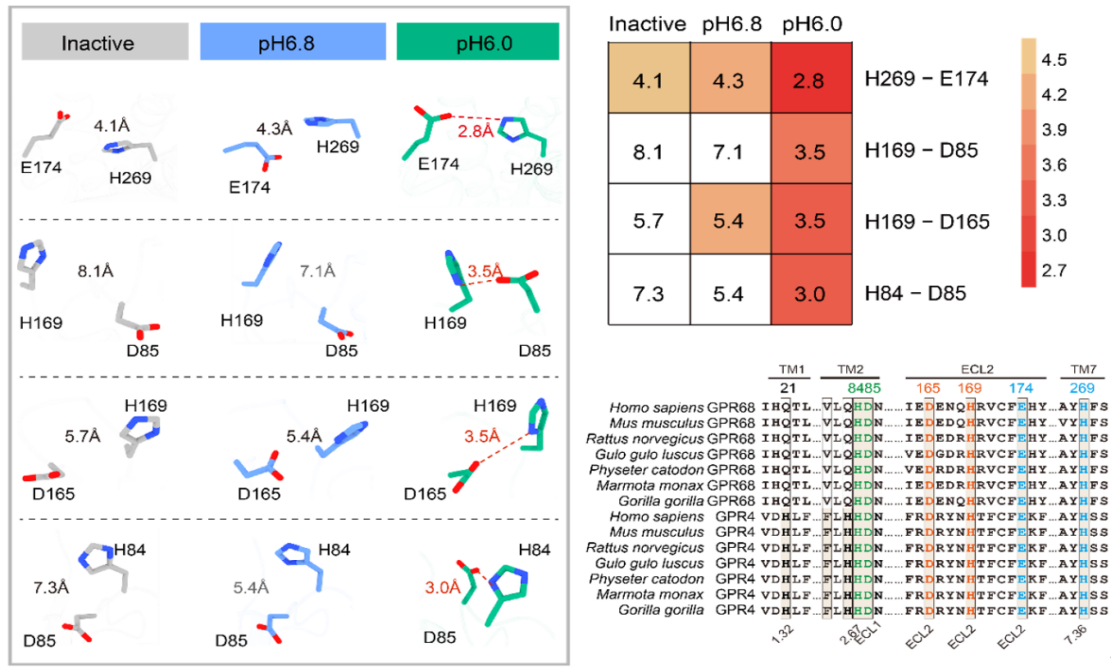结合基于结构的pKa计算、pH依赖的活性测定、分子模拟以及突变功能分析,研究者首先发现两个保守的胞外组氨酸残基——位于ECL2的H165ECL2-45.47×47TM6的H2697.36——在质子化后能够分别诱导与D161ECL2-45.43E170ECL2-45.52等氨基酸的极性网络的形成,并驱动TM6与ECL2之间发生构象重排。这些变化构成了GPR4和GPR68质子诱导激活的核心共性机制。从原子分辨率水平明确揭示了这两个关键组氨酸残基在质子化状态下所引发的特异性构象改变及其在极性网络重构与受体激活中的关键作用(图3)。