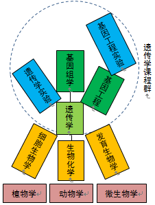 遗传学课程群的组成及与其他课程之间的关系,遗传学是生命科学教学体系的核心课程,也是遗传学课程群的基础课程。