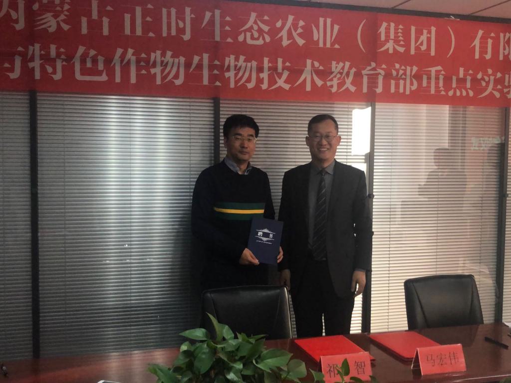 12月27日上午, “牧草与特色作物生物技术教育部重点实验室” 和内蒙古正时生态农业(集团)有限公司在内蒙古呼和浩特市举行了签约仪式,生命科学学院祁智教授代表牧草与特色作物生物技术教育部重点实验室作讲话;马宏伟总裁与祁智教授签署了合作协议;马宏伟总裁向祁智教授颁发了聘书;米兰博士,孙永伟博士,燕芳博士, 轩辕国超博士;内蒙古正时草业有限责任公司总经理李福柱、生产厂长李文亮、农机总监苏俊喜和技术总监刘丽平参加会议。