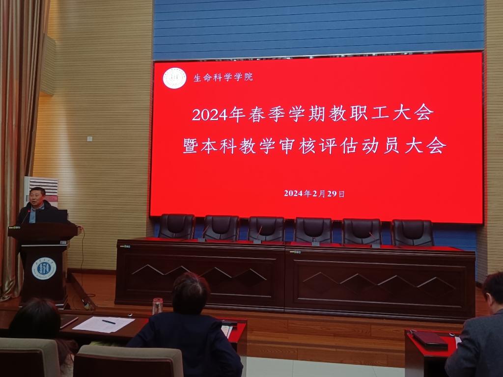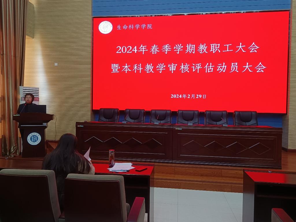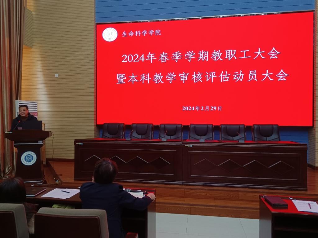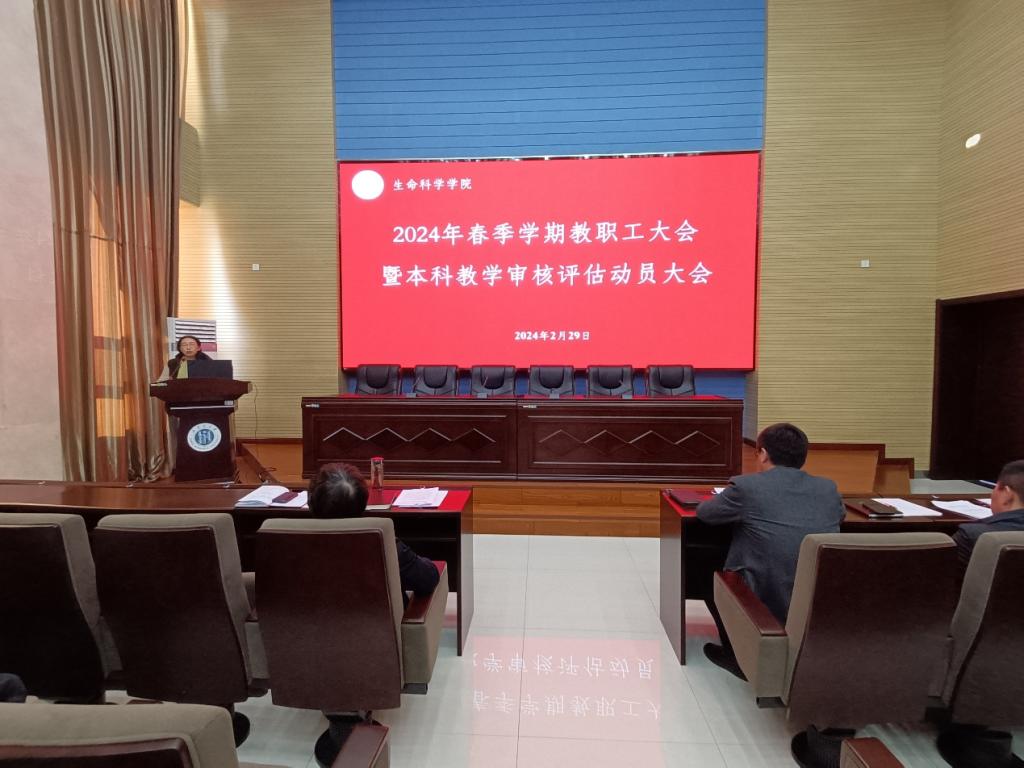 2月29日下午,生命科学学院在国重楼320会议室召开全院教职工大会暨本科教学审核评估动员大会,学院班子成员,全院教职工参加会议。会议由生命科学学院党委书记张慧荣主持。