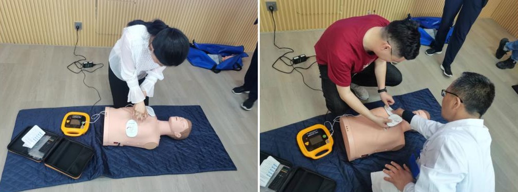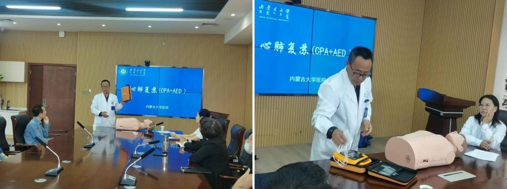 在培训会上,首先由额尔敦医生和郑晓园医生讲解了急救的条件及措施,然后示范了心脏按压和AED设备的使用。随后老师们在两位医生的指导下进行了模拟演练。