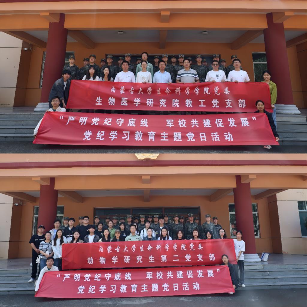 为深入推进党纪学习教育,积极开展党建共建交流。6月7日,生物医学研究院教工党支部与生命科学学院研究生动物学第二党支部赴武警驻呼某中队联合开展了“严明党纪守底线 军校共建促发展”党纪学习教育主题党日活动。生物医学研究院教工党支部成员、生命科学学院研究生动物学第二党支部党员代表参加此次活动。