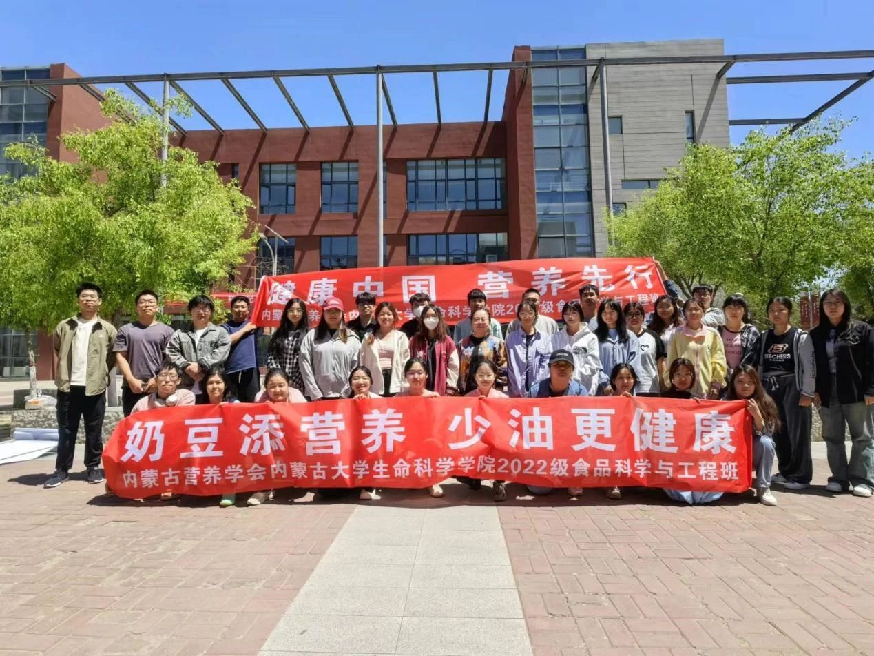 为倡导减油、增豆、加奶理念,引导居民合理搭配日常膳食,养成良好饮食习惯,生命科学学院于2024年5月14至15日在内蒙古大学南校区食堂东门举办了“奶豆添营养,少油更健康”2024年全民营养周活动。此次活动由2022级食品科学与工程专业全体同学在内蒙古大学南校区食堂东门进行宣传。