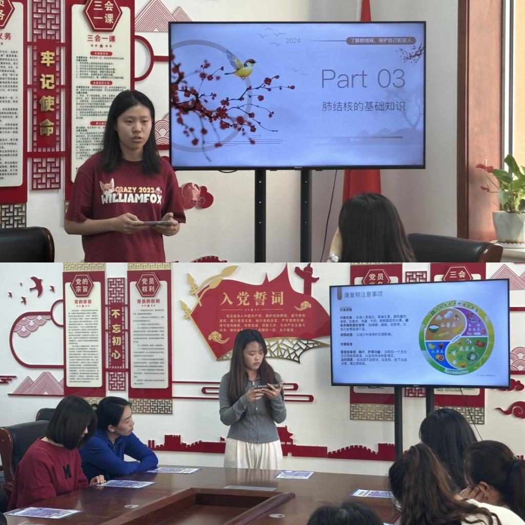 首先,由郑烨同学针对肺结核在老年群体里的传播性以及老年人的免疫问题进行了详细介绍,接着播放肺结核防治视频,让党员们、志愿者们更具体地了解了肺结核病毒。然后孟佳欣同学进行补充,讲解感染肺结核后康复期的注意事项,宣讲最终由一个肺结核传播科普视频收尾。