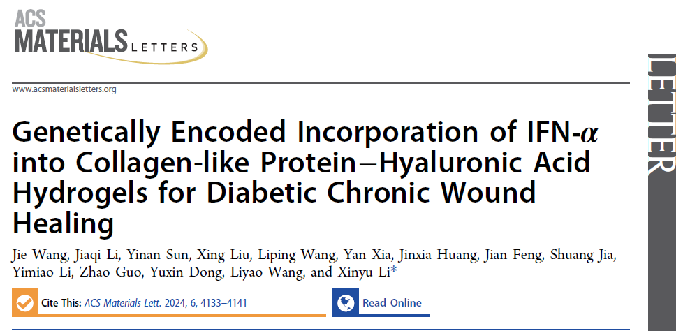 近日,DB中国旗舰官方网站李昕宇课题组在《ACS Materials Letters》(中科院一区,IF9.6)发表题为 “Genetically Encoded Incorporation of IFN-α into Collagen-like Protein–Hyaluronic Acid Hydrogels for Diabetic Chronic Wound Healing” 的研究论文,该论文以封面论文形式发表。原文链接:https://pubs.acs.org/10.1021/acsmaterialslett.4c01170干扰素α在难愈性创伤修复中通过多重机制发挥作用,包括增强免疫防御、抑制感染、调控...